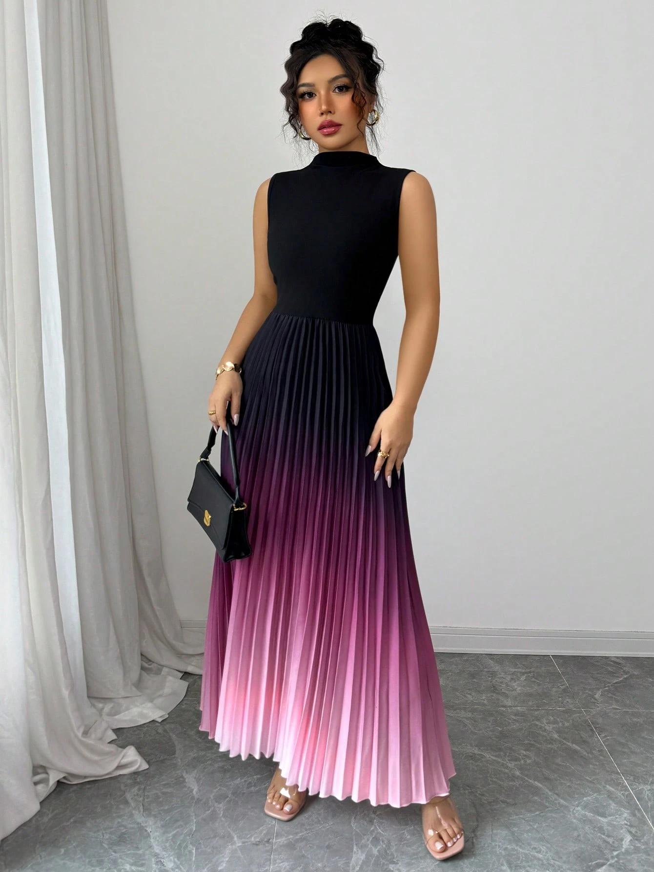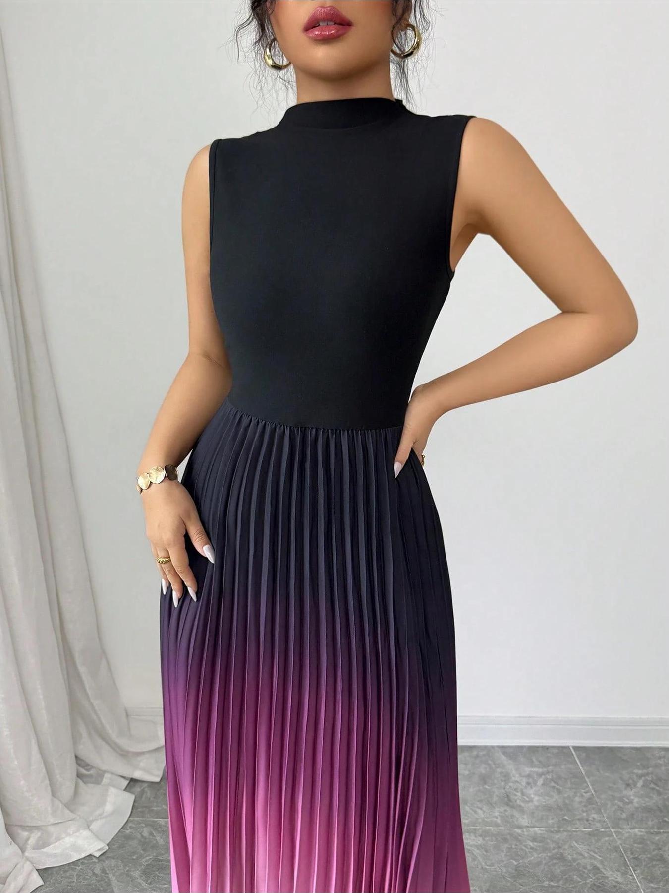 Women'S Elegant Gradient Ombre Sleeveless Maxi Dress - High Neck A-Line Silhouette with Puff Sleeve Accent, Vibrant Purple-Pink-Purple Print, Lightweight Summer Formal & Semi-Formal Evening Gown for Beach Parties, Weddings