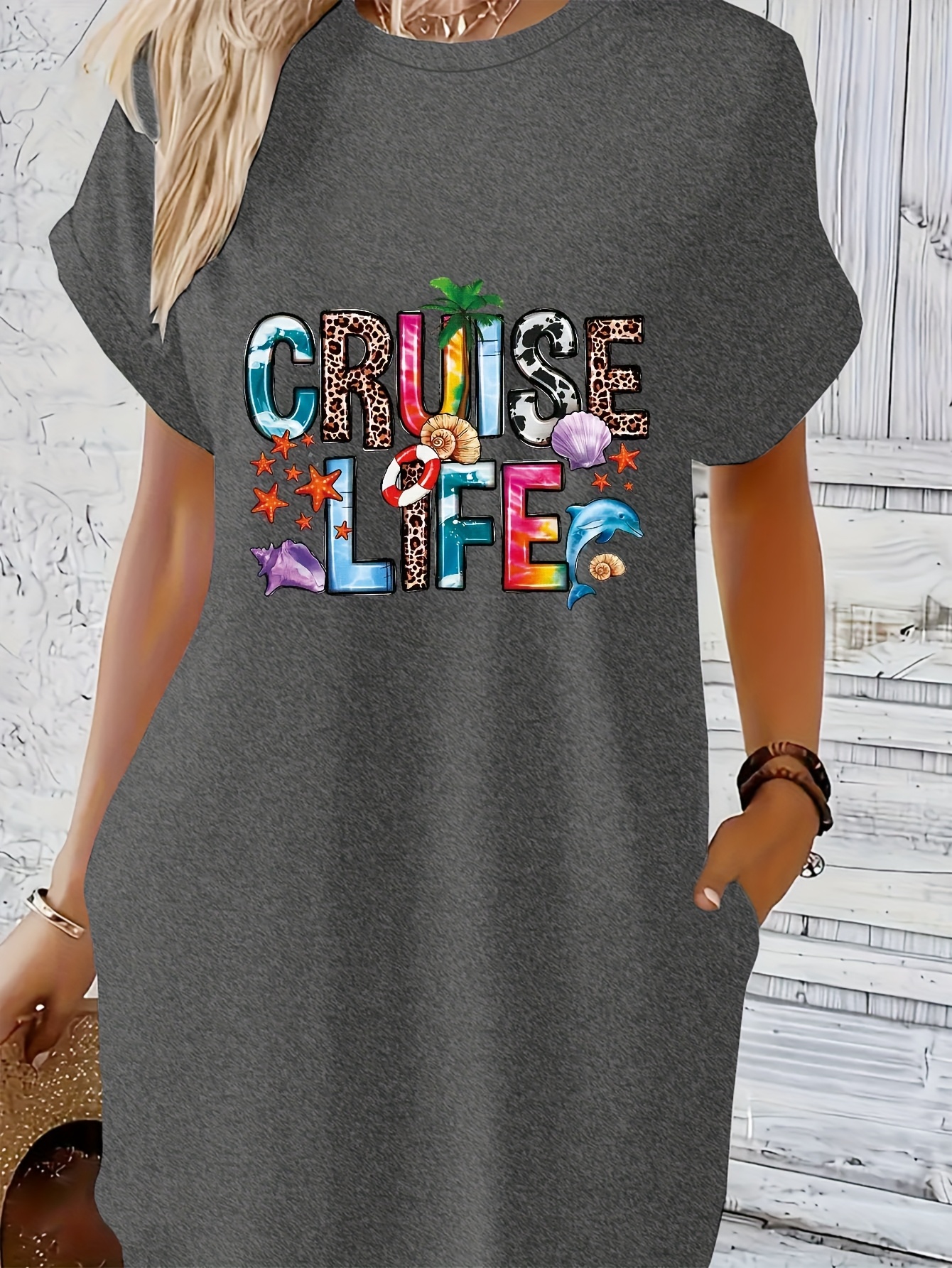 Women's Tropical Vacation Dress - Dark Grey T-Shirt Dress with Cruise Life Graphic, Short Sleeve Beach Outfit, Machine Washable Casual Summer Dress for Women, Beach Dress, Spring Fashion, Relaxed Fit, Comfortable Fabric, Travel Essentials, Holiday Outfit, Lightweight Material, Women's Fashion