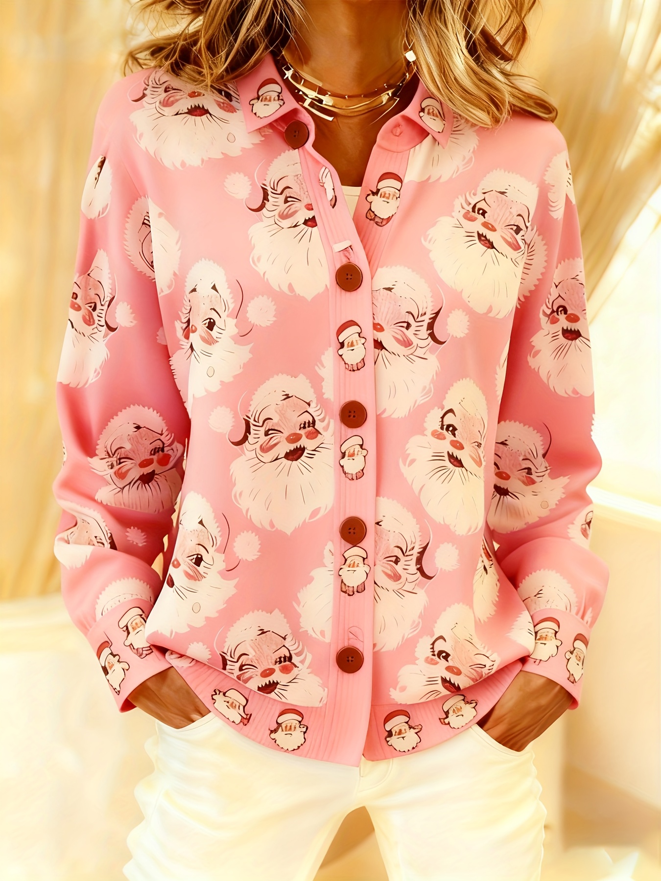 Women's Lapel Button Front Cardigan Jacket with Santa Claus & Christmas Prints - Warm Winter Coat for Christmas Parties, Lapel Collar Outerwear, Machine Washable Blazer (Autumn/Winter), 2D Flat
