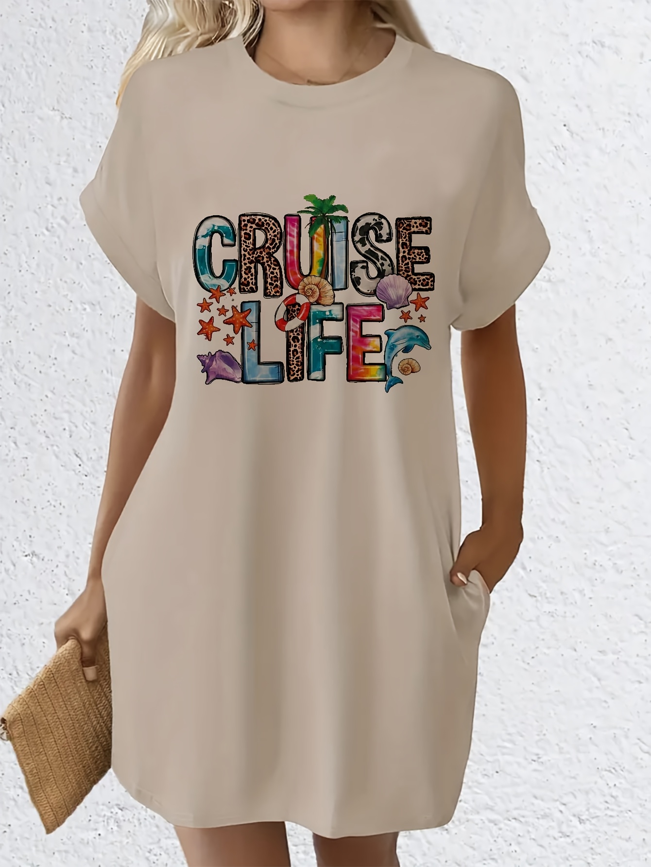 Women's Tropical Vacation Dress - Dark Grey T-Shirt Dress with Cruise Life Graphic, Short Sleeve Beach Outfit, Machine Washable Casual Summer Dress for Women, Beach Dress, Spring Fashion, Relaxed Fit, Comfortable Fabric, Travel Essentials, Holiday Outfit, Lightweight Material, Women's Fashion