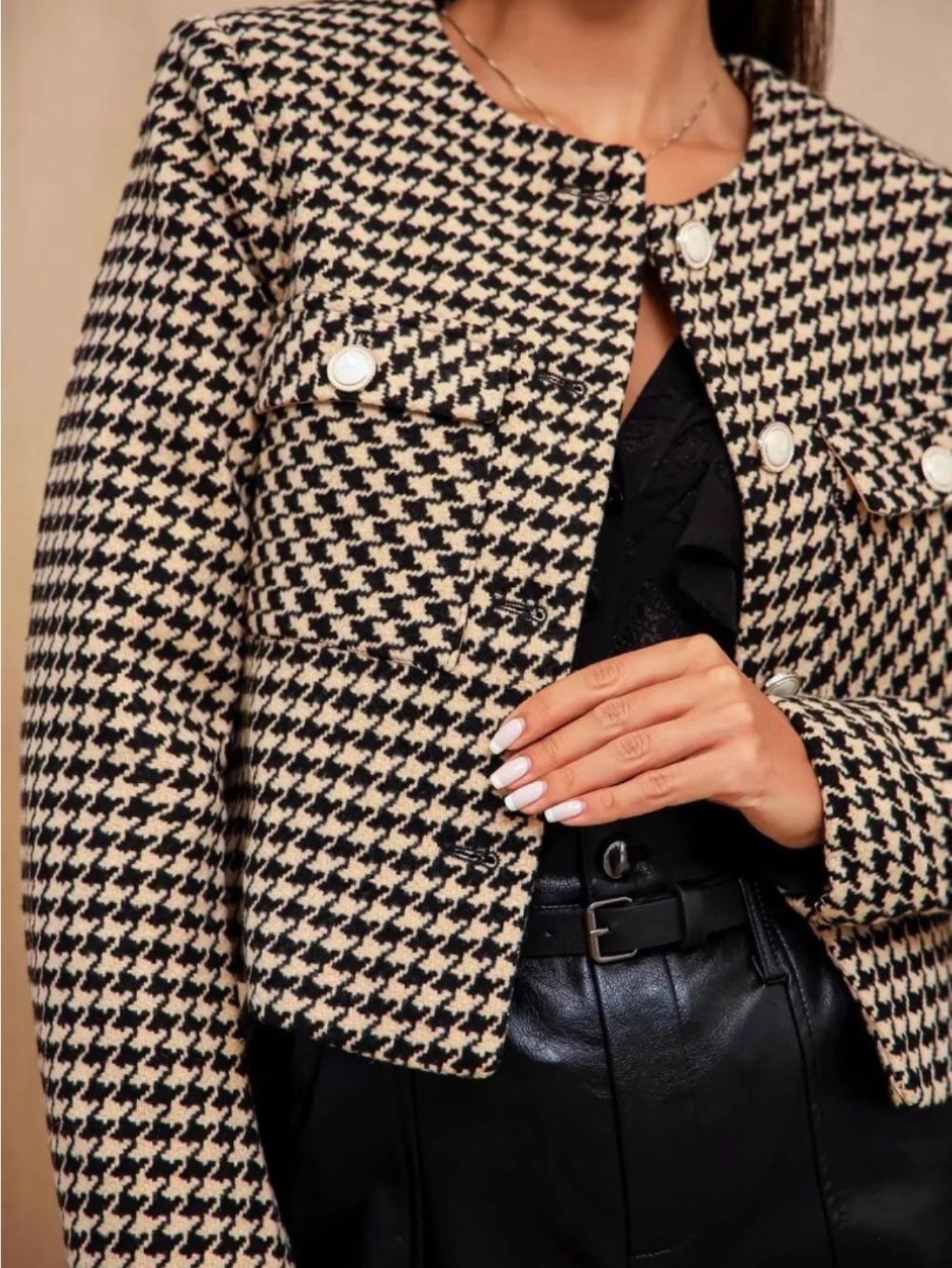 Classic Black & White Houndstooth Tweed Jacket with Double Button-Front Closure, Metal Buckle & Proportional Collar - Casual Coat for Spring/Fall Layering (Hand Washable) - Versatile for Jeans, Dresses, or Blouses