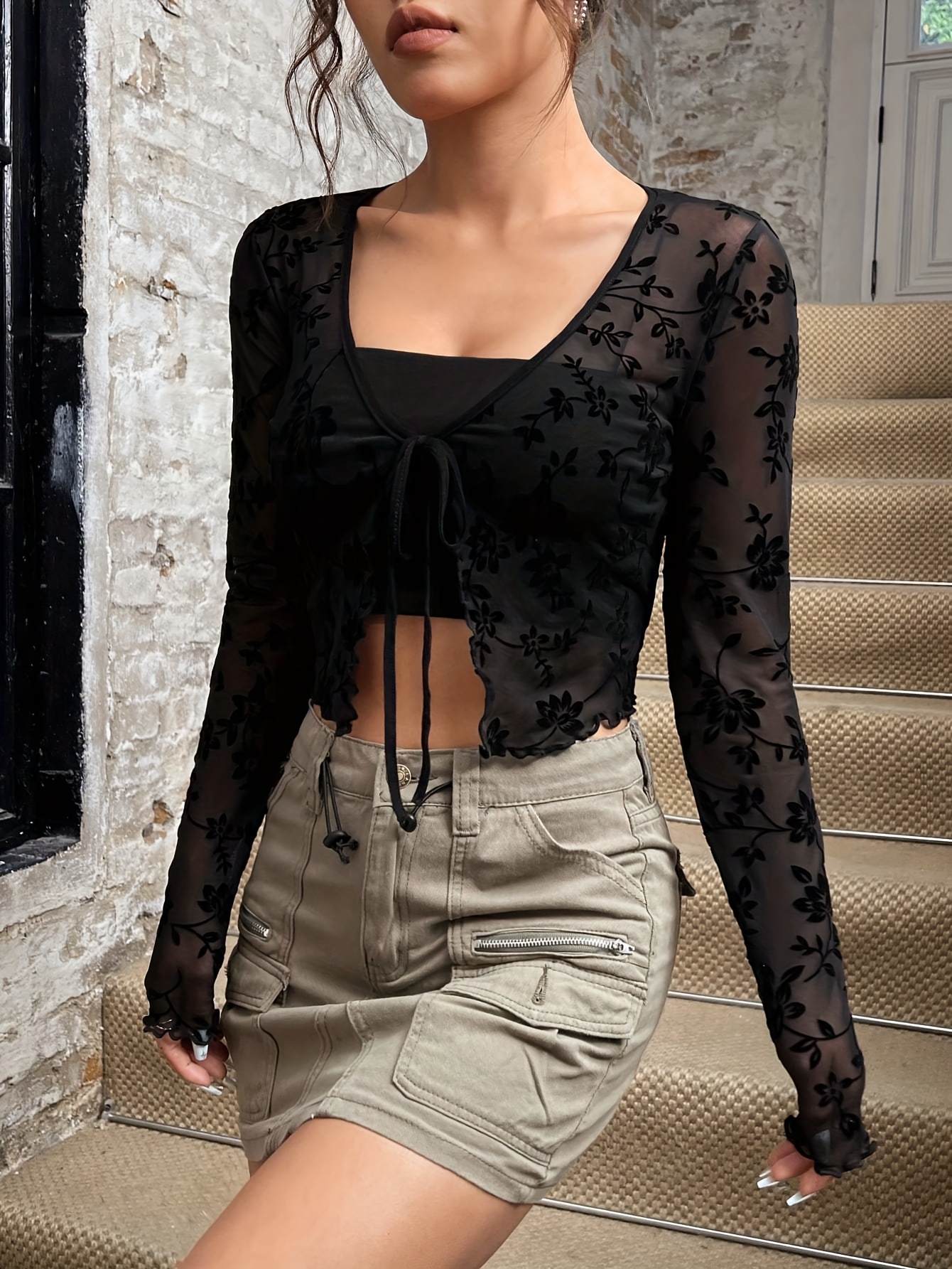 Women's Semi-Sheer Blouse with Botanical Leaf Print & Adjustable Tie-Front - Lightweight All-Season Lace-Like Sheer Panel Shirt, Hand Washable Elegant Casual to Dressy Tops (Plant Pattern)