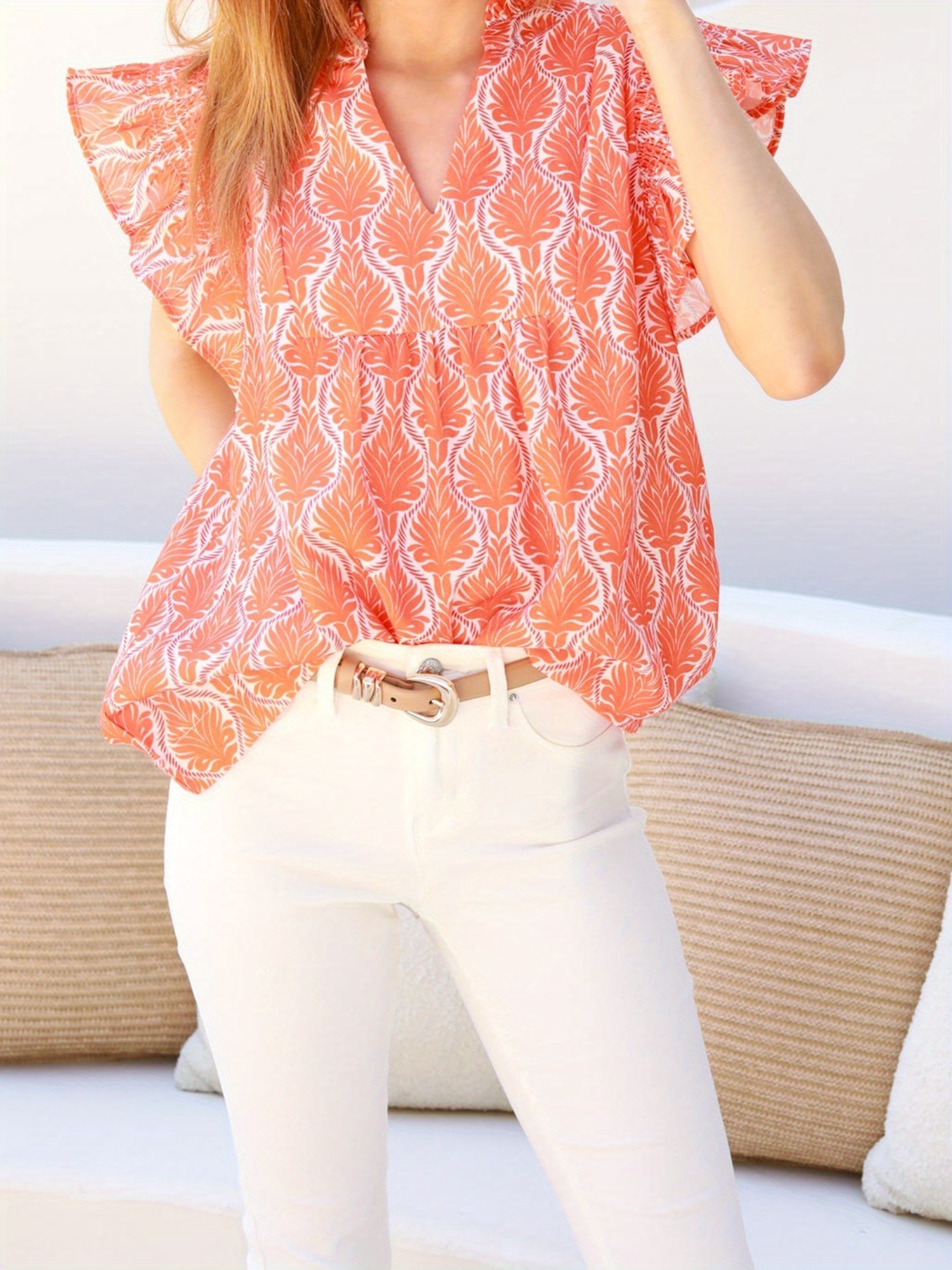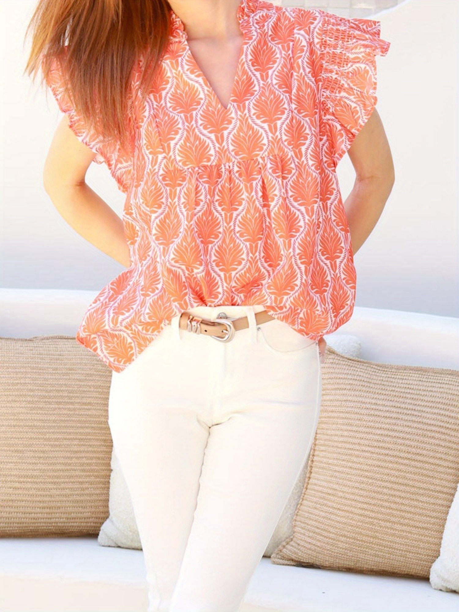 Women'S Summer Sleeveless V-Neck Tank Top - Vibrant Orange & White All-Over Print Loose Fit Flowy Shirt with Ruffled Hem, Lightweight Breathable Casual Blouse for Beach, Spring Summer Fall Layering, Versatile Everyday & Semi-Formal Wear, Seasonal Wardrobe Staple, Flowy Fabric, Blouse For Women Dressy Casual, Beautiful Blouse For Women, Elegant Blouse For Women, Women Top And Blouse, Blouse For Women, Top For Women