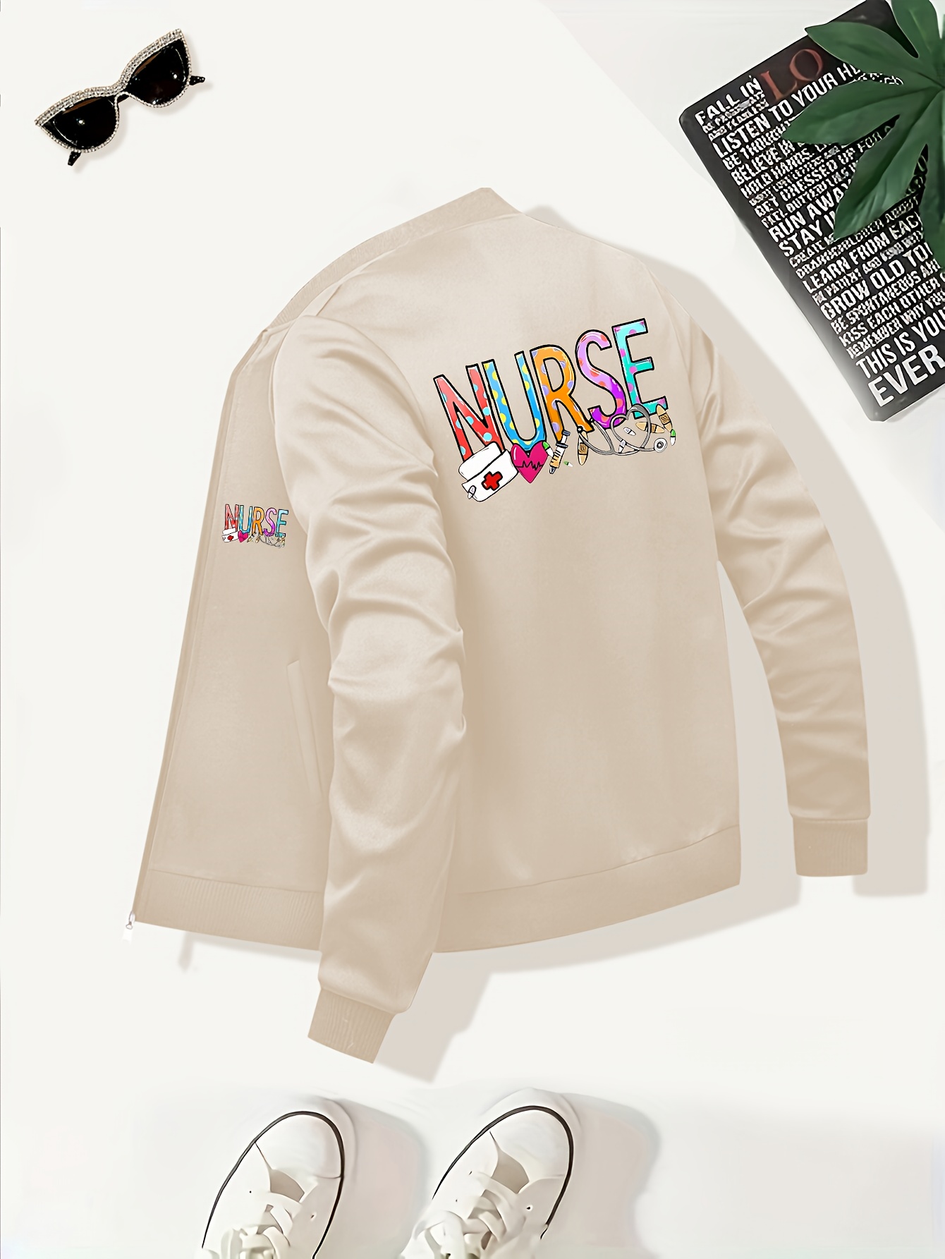 Women'S Casual Zip-Up Jacket with "Nurse" Print, Baseball Collar, Pockets, Slight Stretch, Fabric - Perfect Gift for Nurses, All-Season Outerwear, Nurse Gifts