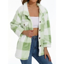 Cozy Plaid Fuzzy Jacket - Soft Thermal Insulation, Button Front, Flap Pockets, Long Sleeve, Casual Chic - Perfect for Fall & Winter, Women's Clothing, Thermal Jacket for Cold Weather