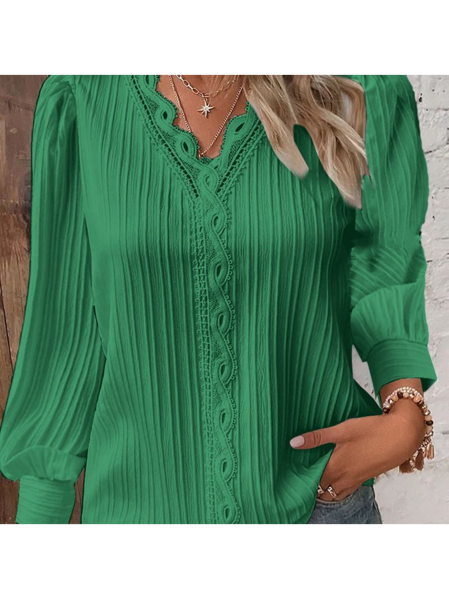 Fall Long Sleeve V-Neck Ruffled Panel Blouse for Women | Feminine Casual, Elegant Style, Solid Color, Suitable for Spring/Fall
