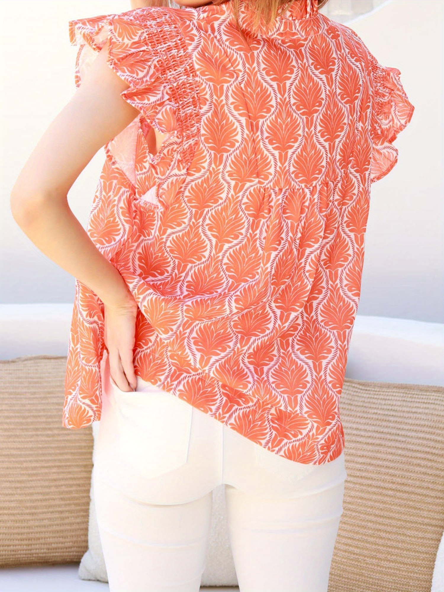 Women'S Summer Sleeveless V-Neck Tank Top - Vibrant Orange & White All-Over Print Loose Fit Flowy Shirt with Ruffled Hem, Lightweight Breathable Casual Blouse for Beach, Spring Summer Fall Layering, Versatile Everyday & Semi-Formal Wear, Seasonal Wardrobe Staple, Flowy Fabric, Blouse For Women Dressy Casual, Beautiful Blouse For Women, Elegant Blouse For Women, Women Top And Blouse, Blouse For Women, Top For Women