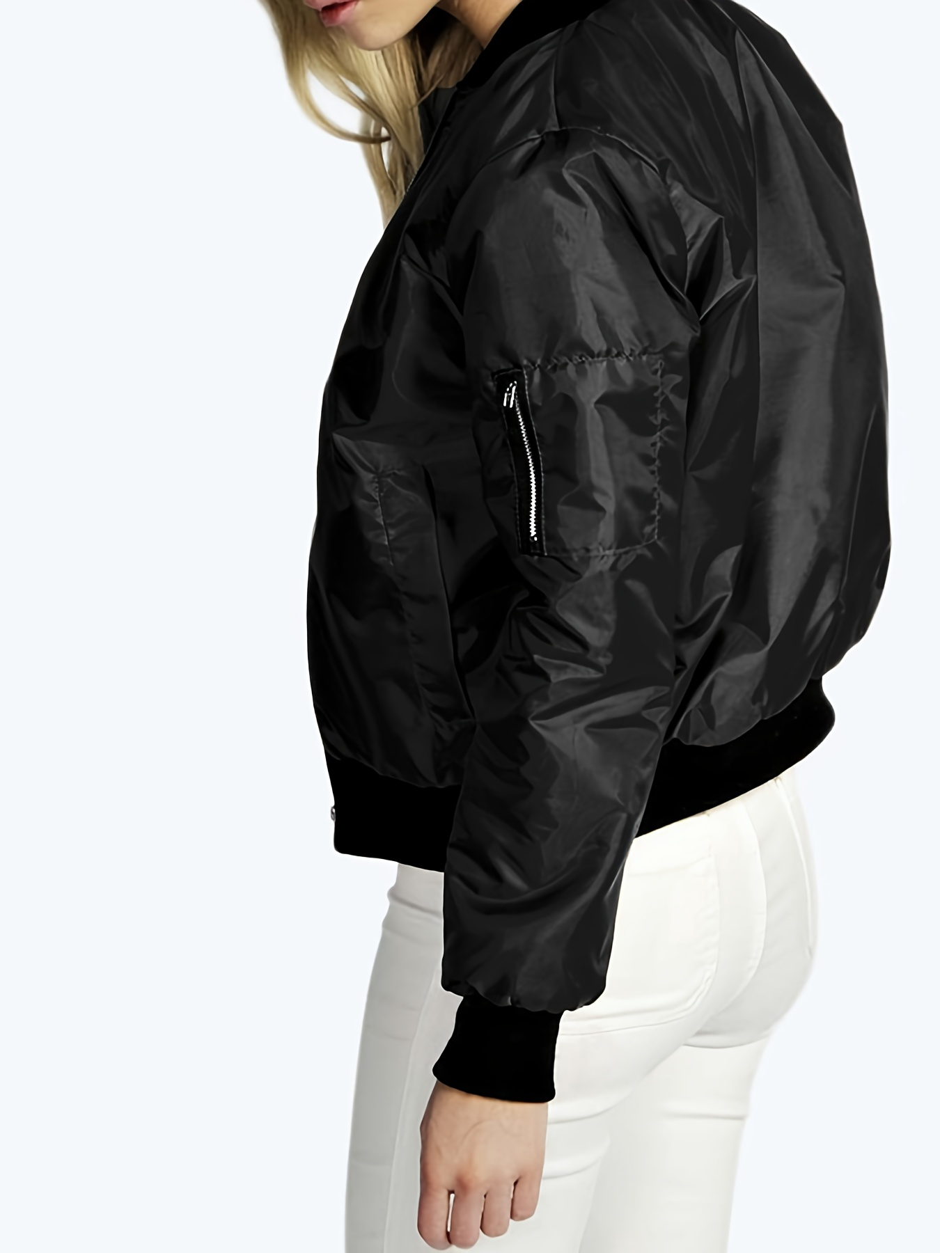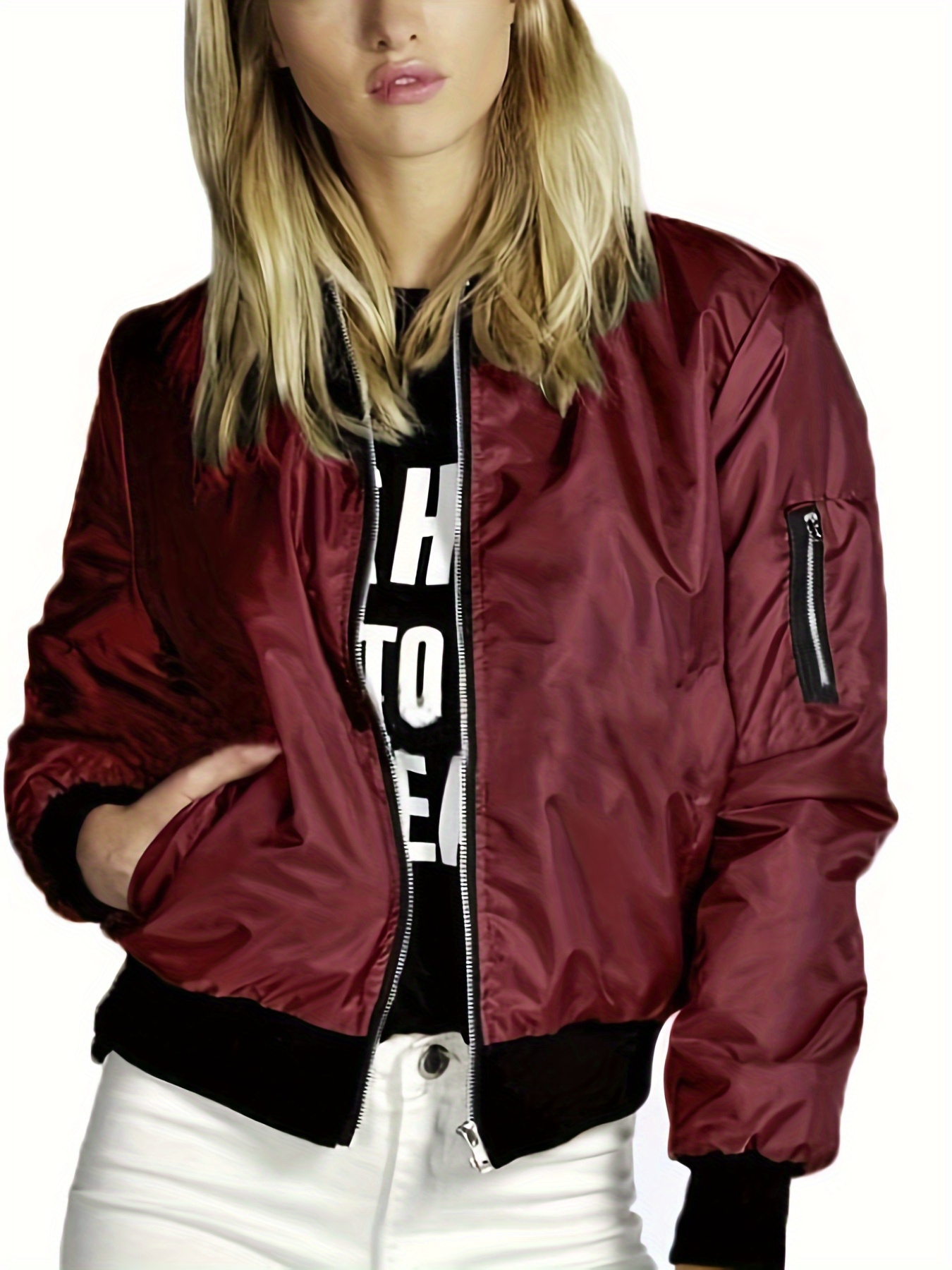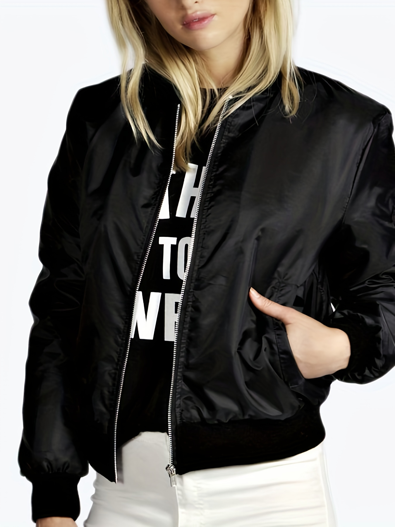 Women'S Classic Bomber Jacket Long Sleeve Stand Collar Zip Up Jacket Loose Fall Outwear